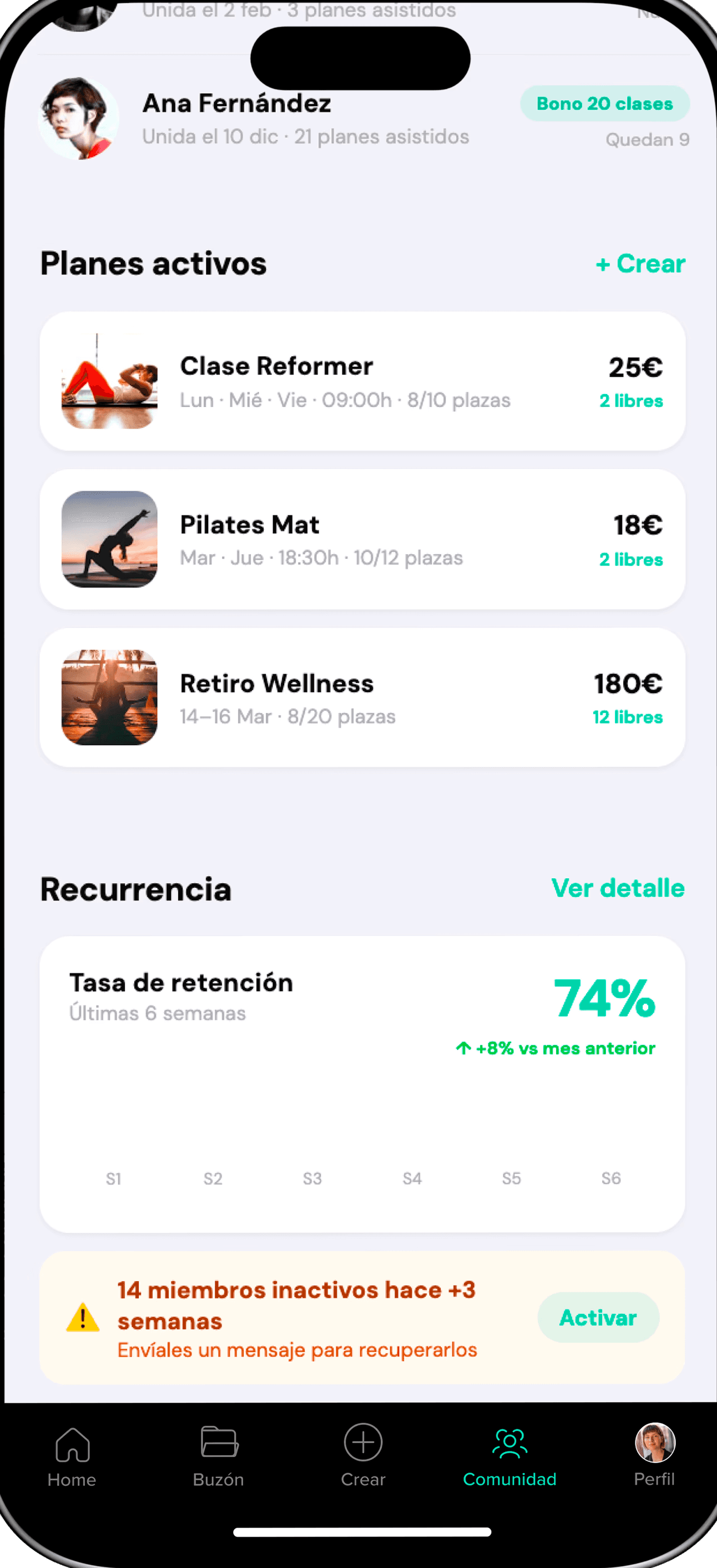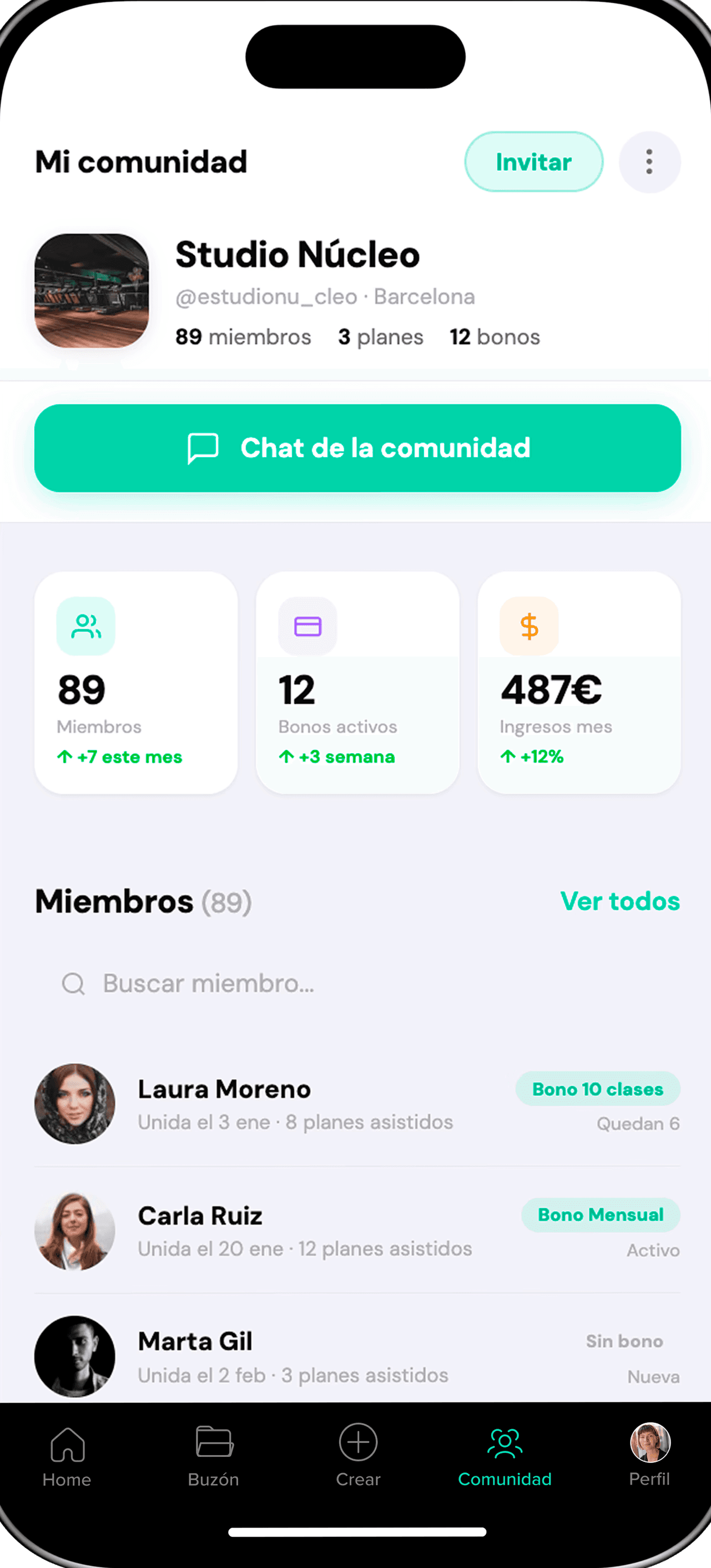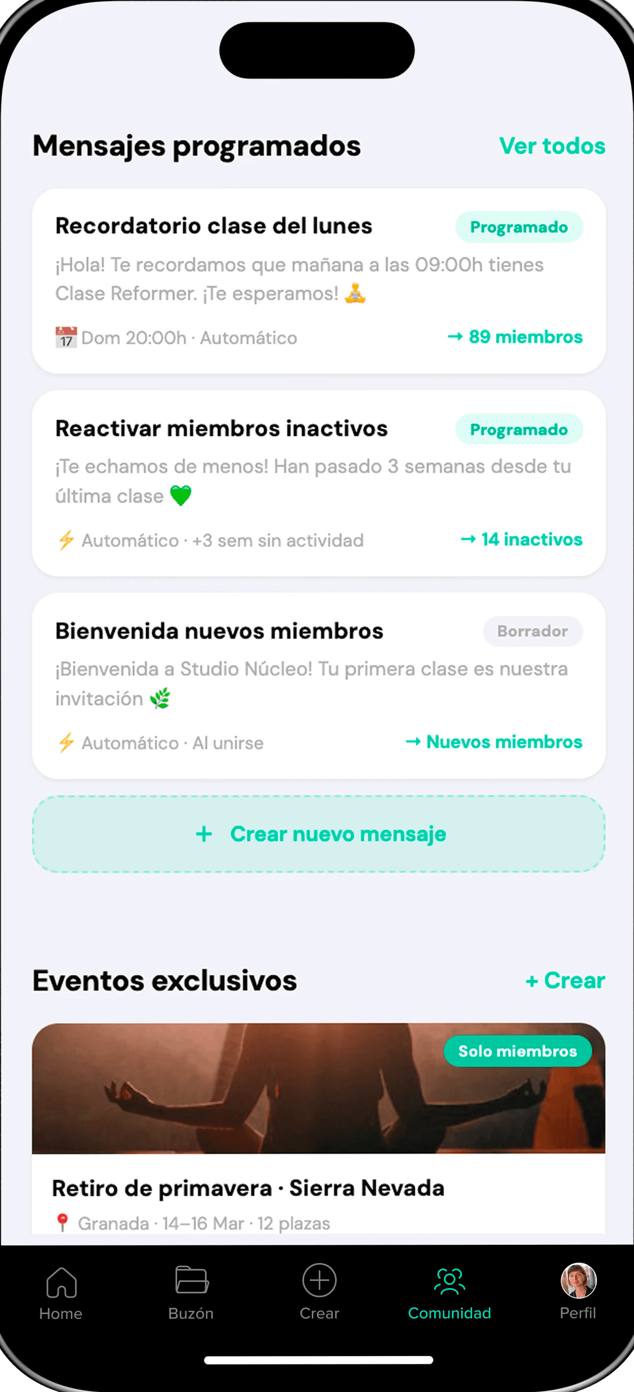 Crea un espacio exclusivo para comunicarte, ofrecer experiencias exclusivas, enviar recordatorios automáticos, y fidelizar a tus alumnos.
